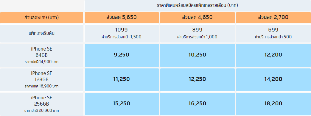 iPhone SE รุ่นที่ 2 ราคาเริ่มต้น 8,300 บาท สำหรับรุ่น 64GB ซื้อพร้อมสมัครแพ็กเกจรายเดือน 4G+ Extra Fun Unlimited ราคา 1,299 บาท ขึ้นไป และชำระค่าบริการล่วงหน้า 5,000 บาท ทำสัญญาใช้บริการนาน 12 เดือน