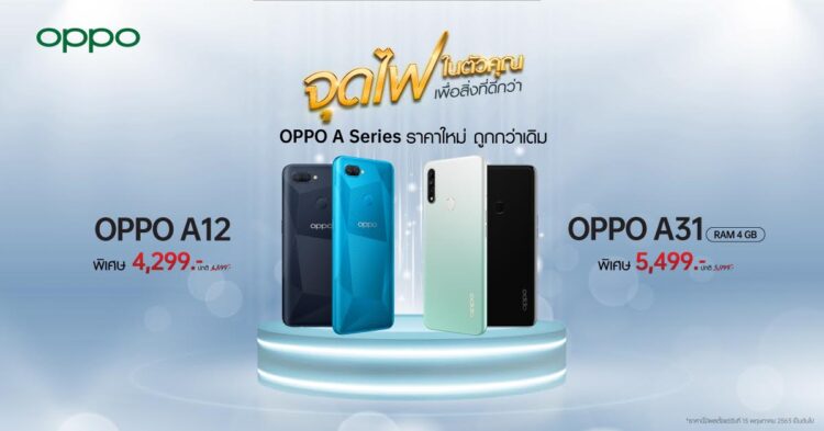 OPPO ผู้นำด้านแบรนด์สมาร์ทโฟนได้จัดแคมเปญ “จุดไฟในตัวคุณ เพื่อสิ่งที่ดีกว่า” เป็นการสนับสนุนและให้กำลังใจแก่ทุกท่าน ให้ผ่านพ้นช่วงเวลาที่ยากลำบากไปด้วยกัน ด้วยการมอบโปรโมชั่นสุดพิเศษให้แก่ลูกค้า พร้อมมีการปรับราคาสมาร์ทโฟน ในรุ่น OPPO A Series ที่โดดเด่นในเรื่องของสเปคที่มีครบทุกฟังก์ชันการใช้งานและราคาสุดคุ้ม โดยล่าสุด มีการประกาศผ่าน OPPO Official Fanpage ใน เฟซบุ๊กว่า มีการปรับราคาสมาร์ทโฟนในซีรีส์ A สองรุ่นคือ OPPO A31 RAM 4 GB เหลือเพียง 5,499 บาท จาก 5,999 บาท และ OPPO A12 เหลือเพียง 4,299 บาท จาก 4,599 บาท เพื่อให้คุณสามารถเป็นเจ้าของ OPPO A31 RAM 4GB และ OPPO A12 ได้ง่ายขึ้น