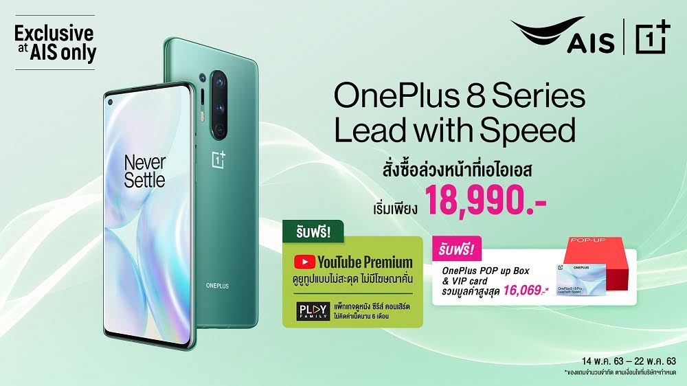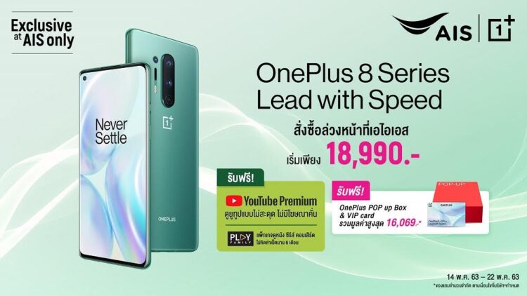 AIS มอบโปรโมชั่นสุดพิเศษให้กับลูกค้าที่สั่งซื้อเครื่องล่วงหน้า OnePlus 8 และ OnePlus 8 Pro กับทาง AIS โดยมอบส่วนลดค่าเครื่องสูงสุด 10,500 บาท (สำหรับลูกค้าย้ายค่ายเบอร์เดิม รับส่วนลดเพิ่มอีก 1,000 บาท) รับเพิ่มฟรี สิทธิดู YouTube Premium และ AIS PLAY FAMILY ฟรีสูงสุด 6 เดือน แถมเพิ่มโปรโมชันสุดเอ็กซ์คลูซีฟจาก AIS รับสิทธิ ชม Netflix นาน 3 เดือนเฉพาะในช่วงสั่งซื้อเครื่องล่วงหน้าเท่านั้น*! ทั้งนี้ สำหรับลูกค้าเอไอเอสรายเดือน ในนามบุคคลธรรมดาเท่านั้น