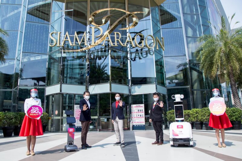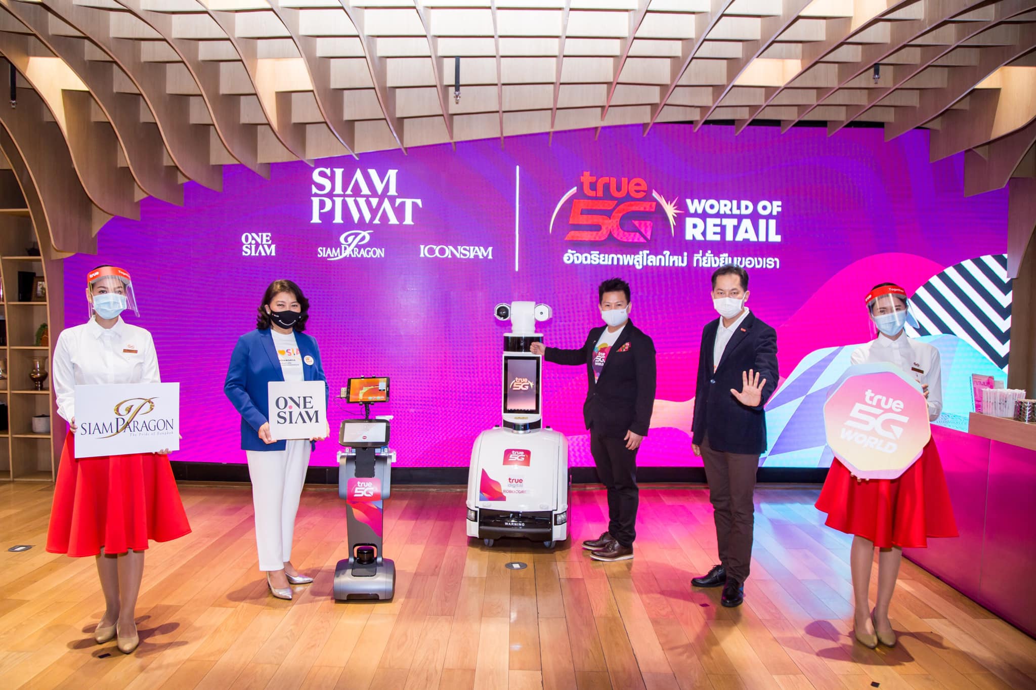 นายพิรุณ ไพรีพ่ายฤทธิ์ หัวหน้าคณะทำงานและกรรมการยุทธศาสตร์ 5G บมจ.ทรู คอร์ปอเรชั่น กล่าวว่า “จากวิสัยทัศน์ True 5G ที่มุ่งนำอัจฉริยภาพของเทคโนโลยี 5G เติมเต็มการใช้ชีวิตในทุกมิติ ด้วยความเชื่อว่าเครือข่าย True 5G จะไม่เป็นเพียงแค่สัญญาณมือถือ แต่เป็นสัญญาณยกระดับศักยภาพของประเทศ ให้มีอัจฉริยภาพเหนือกว่าและเกิดการเปลี่ยนแปลงอย่างยั่งยืนในทุกมิติ และเมื่อรัฐบาลมีมาตรการผ่อนปรนให้ธุรกิจต่างๆกลับมาเปิดบริการได้ กลุ่มทรู จึงตอกย้ำความเป็นพันธมิตรอย่างต่อเนื่องยาวนานกับ สยามพิวรรธณ์ ด้วยการนำเครือข่ายอัจฉริยะ True 5G มาเติมเต็มการใช้ชีวิตในโลกของธุรกิจค้าปลีก True 5G World of Retail ตอบโจทย์การเปิดให้บริการวิถีใหม่ New Normal ของศูนย์การค้าสยามพารากอน และไอคอนสยาม เพื่อให้เป็น 5G Destination ที่ทันสมัยที่สุด เพิ่มสุนทรียภาพการช้อปปิ้งอย่างไร้กังวลแก่ลูกค้า โดยนำร่องพัฒนาฟังก์ชันเพิ่มเติมของหุ่นยนต์ True 5G Temi Thermal ScanBot ให้สามารถวัดอุณหภูมิร่างกายเบื้องต้น ด้วยนวัตกรรมตรวจจับความร้อนและแจ้งเตือนอัจฉริยะ ที่ได้รับการยอมรับจากบริษัทชั้นนำทั่วโลก มีประสิทธิภาพความแม่นยำมากกว่า ด้วยกล้องที่สแกนพร้อมกันถึง 3 จุด และสามารถแจ้งเตือนผู้เกี่ยวข้อง เมื่อมีผู้อุณหภูมิสูงกว่า 37.5 เข้ามาในพื้นที่ พร้อมติดตั้งเจลล้างมือฆ่าเชื้อแบบอัตโนมัติ รวมถึง True 5G PatrolBot ที่เพิ่มเซนเซอร์วัดอุณหภูมิร่างกาย ในหุ่นยนต์ตรวจการณ์ ซึ่งคอยลาดตระเวนดูแลเรื่องความปลอดภัยภายในและภายนอกอาคาร ทั้งกลางวัน กลางคืน มีระบบ Face Detection หากพบผู้ไม่ใส่หน้ากาก จะเดินเข้าไปเตือนทันที อีกทั้งสามารถวิเคราะห์ความผิดปกติหรือสภาวะเสี่ยง บันทึกภาพจดจำใบหน้า ทะเบียนรถ และส่งข้อมูลประมวลผลได้แบบ Real-time ผ่านระบบ Cloud AI”
