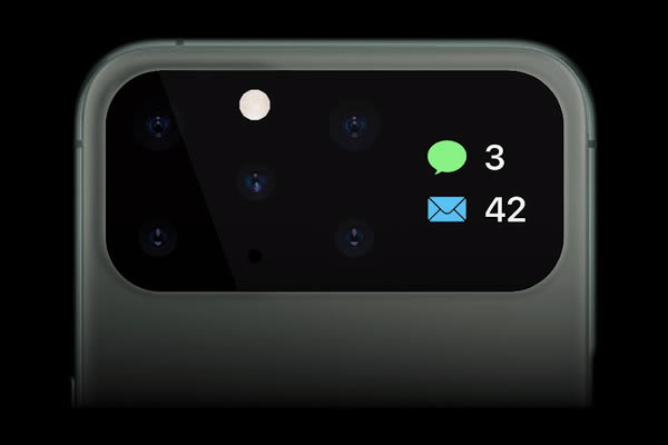 อีกไฮไลท์ที่น่าสนใจอยู่ด้านหลัง เนื่องจากมาพร้อมกล้อง 5 ตัว และติดตั้งจอแสดงผลที่สองไว้ใกล้กัน สำหรับแสดงการแจ้งเตือน และคาดว่าจะใช้เป็นช่องมองภาพเพื้นช่วยในการถ่ายเซลฟี่