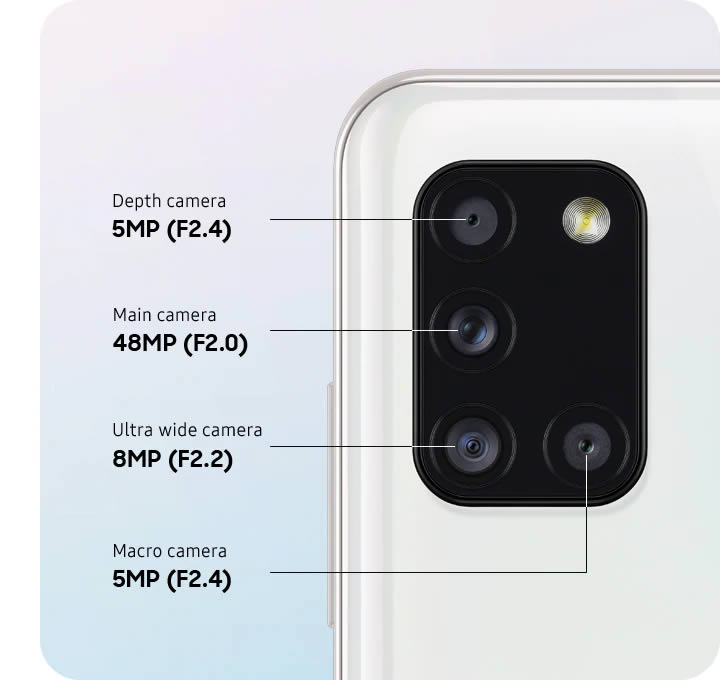 Samsung Galaxy A31 มาพร้อมจอแสดงผล Super AMOLED ขนาด 6.4 นิ้ว ดีไซน์ Infinity-U Display ซ่อนกล้องเซลฟี่ 20 ล้านพิกเซล ไว้ในรอยบากรูปตัว U ส่วนกล้องหลัง 4 ตัว จัดวางเป็นรูปตัว L ประกอบด้วย กล้องหลัก 48 ล้านพิกเซล กล้องอัลตร้าไวด์ 8 ล้านพิกเซล มุมมอง 123 องศา กล้องมาโคร 5 ล้านพิกเซล ถ่ายได้ใกล้สูงสุด 4 เซนติเมตร และกล้อง Depth ความละเอียด 5 ล้านพิกเซล สำหรับถ่ายหน้าชัดหลังละลาย