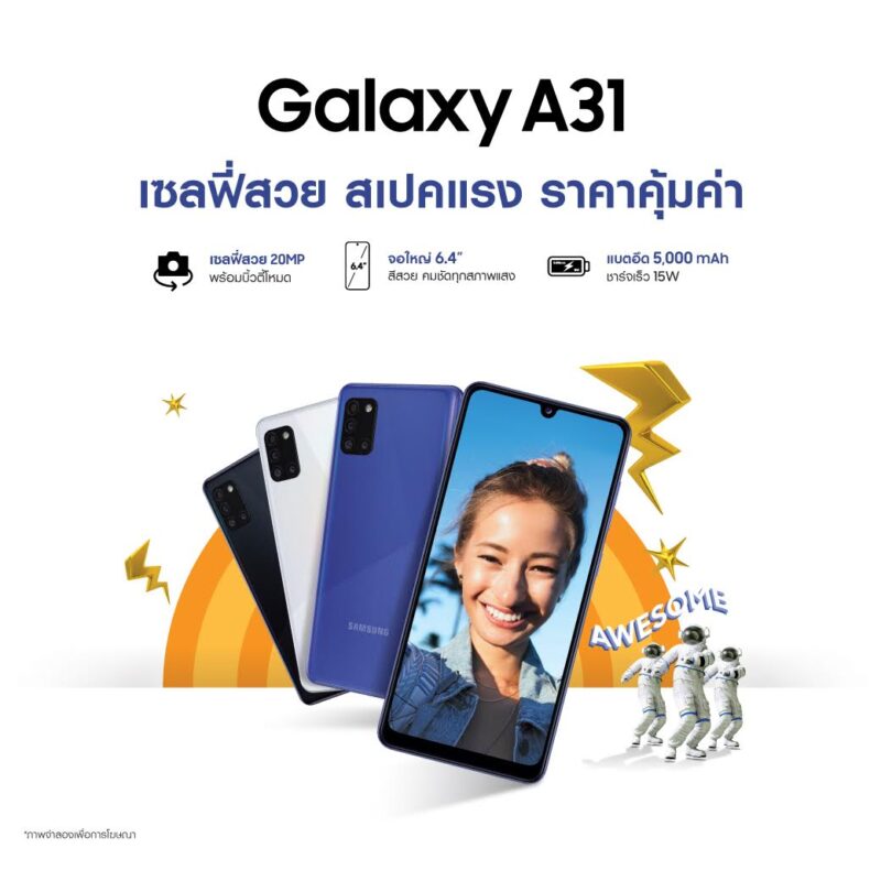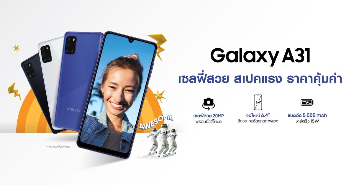 กาแลคซี่ A31 สมาร์ทโฟน เซลฟี่สวย สเปคแรง ราคาคุ้มค่า รุ่นล่าสุดจากตระกูล กาแลคซี่ เอ ซีรีส์ ที่มาพร้อมกล้องหน้าความละเอียดสูงถึง 20 ล้านพิกเซลเซลฟี่หน้ากระจ่างใสด้วยบิวตี้โหมดให้ทุกภาพเซลฟี่สวยสะดุดตาแบบไร้ที่ติ พร้อมปลดปล่อยความครีเอทีฟไปกับ ฟีเจอร์ AR Sticker และ AR Doodle สร้างสรรค์จินตนาการให้ภาพเซลฟี่โดดเด่นไม่เหมือนใคร นอกจากนี้ตัวเครื่องยังถูกออกแบบมาให้มีขนาดพอดีกับฝ่ามือ พร้อมหยิบขึ้นมาเซลฟี่ได้ไม่มีสะดุด ถ่ายแล้วปิ๊ง โพสต์แล้วป๊อป พร้อมเรียกยอดไลค์ได้ทุกเมื่อ