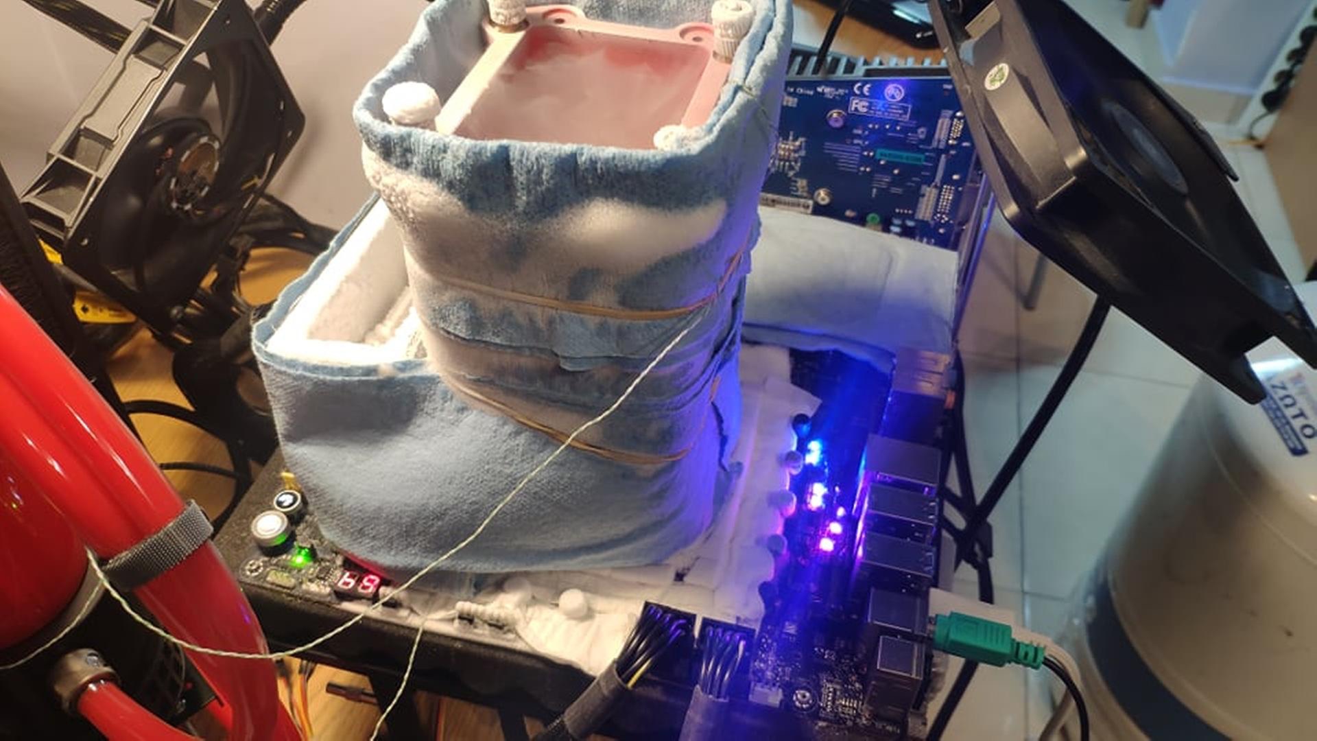 เพื่อเข้าถึงความเร็วระดับนั้น Elmor เลือกใช้เมนบอร์ด ASUS ROG Maximus XII APEX ที่ออกแบบมาเพื่อการโอเวอร์คล็อก ใช้ไฟ 1.194V และระบบระบายความร้อน Liquid Helium