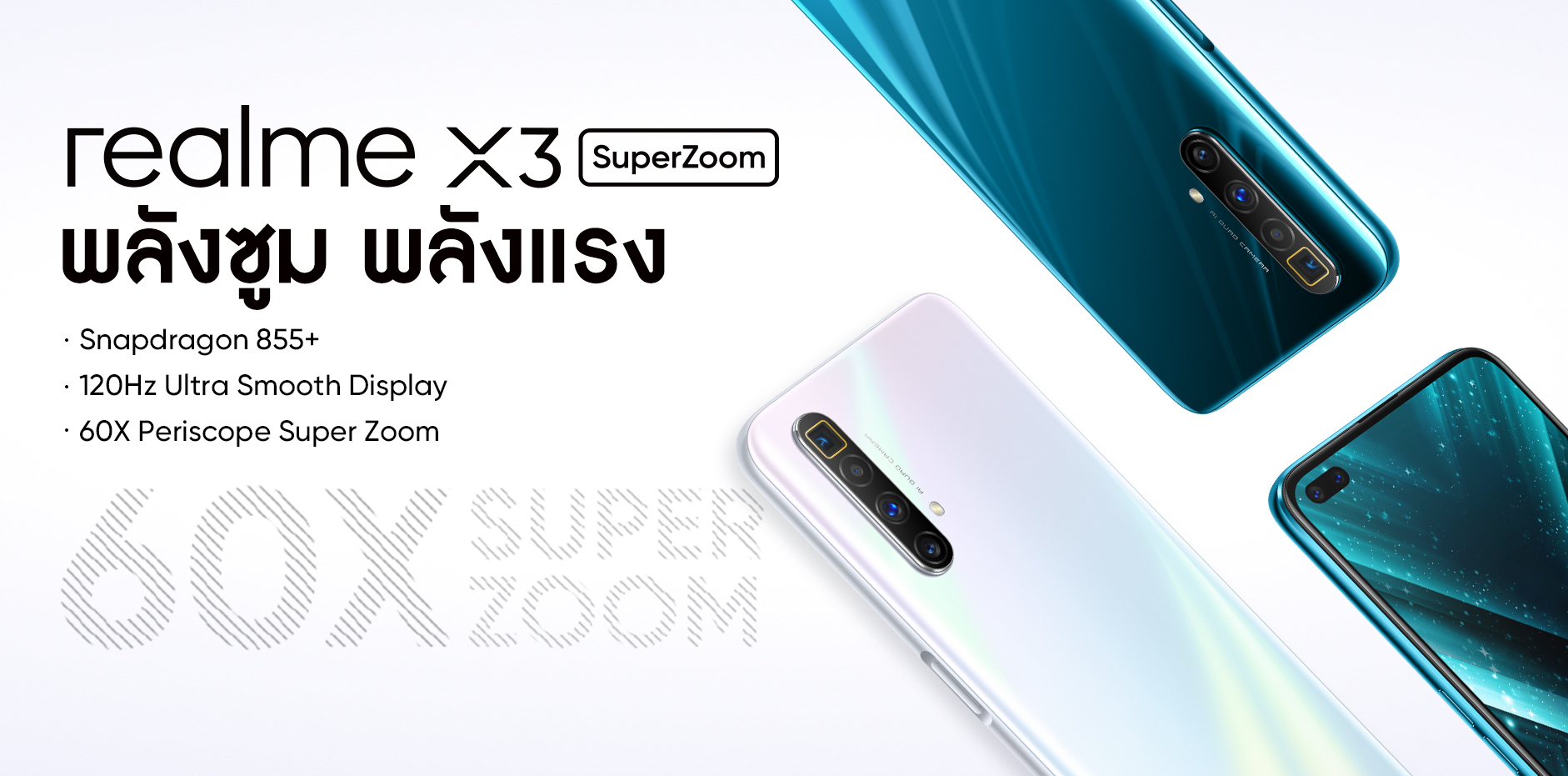 realme เปิดตัวสมาร์ทโฟนเรือธง realme X3 SuperZoom อย่างทางการในประเทศไทย มาพร้อมสโลแกน “พลังซูม พลังแรง” ด้วยระบบกล้องหลัง 64MP Quad Camera มาพร้อมเลนส์ Periscope รองรับ 60X Super Zoom รองรับโหมดถ่ายภาพดวงดาวยามค่ำคืน (Starry Mode) และชิปประมวลผลระดับเรือธง Qualcomm Snapdragon 855 Plus