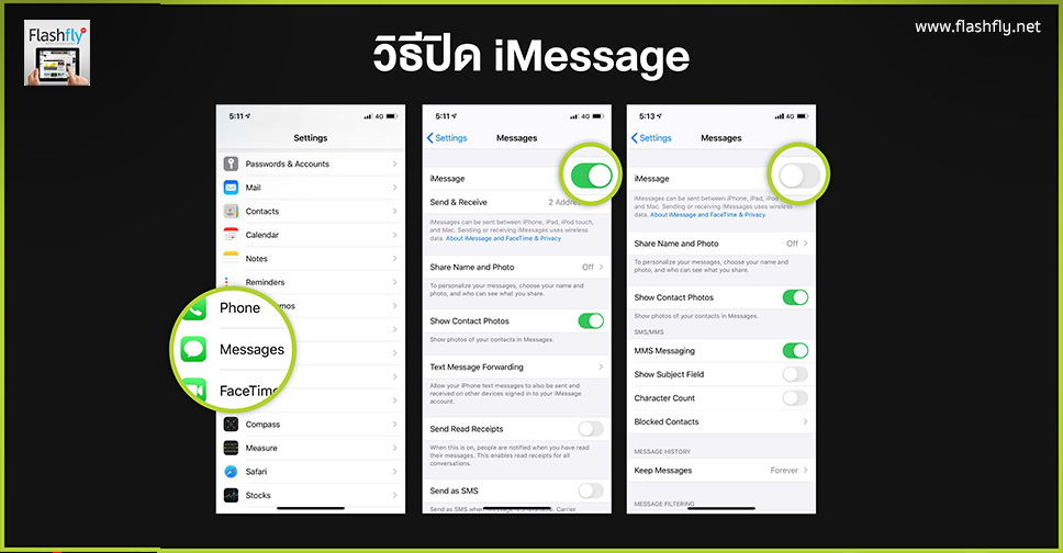 โดยเข้าไปที่เมนูตั้งค่า → เลือกข้อความ → เลื่อนแถบปิดที่เมนู iMessage