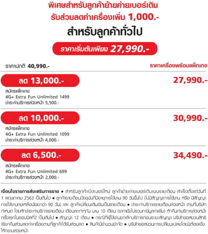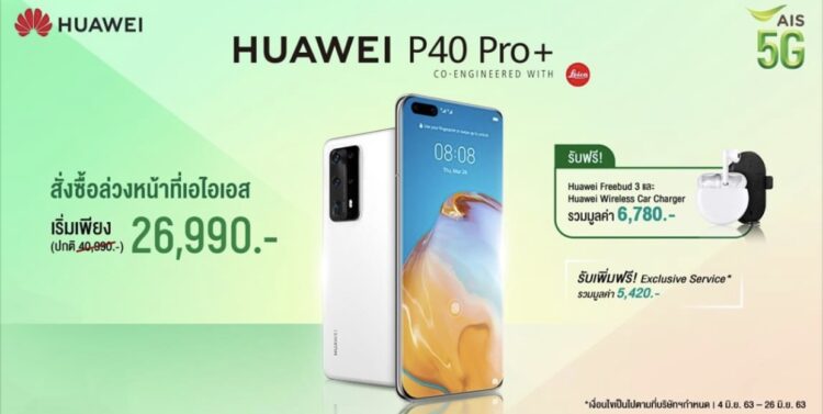 AIS มอบส่วนลดสูงสุด 13,000 บาท เมื่อซื้อเครื่องพร้อมสมัครแพ็กเกจ 4G Hot Deal MAXX สำหรับลูกค้าปัจจุบันในระบบรายเดือน และรับส่วนลดเพิ่มอีก 1,000 บาท สำหรับลูกค้าย้ายค่ายเบอร์เดิม จึงสามารถเป็นเจ้าของ HUAWEI P40 Pro Plus 5G ในราคาเริ่มต้นเพียง 26,990 บาท อย่างไรก็ตาม จะต้องชำระค่าบริการล่วงหน้า 6,000 บาท และจ่ายรายเดือนขั้นต่ำ 1,349 บาท