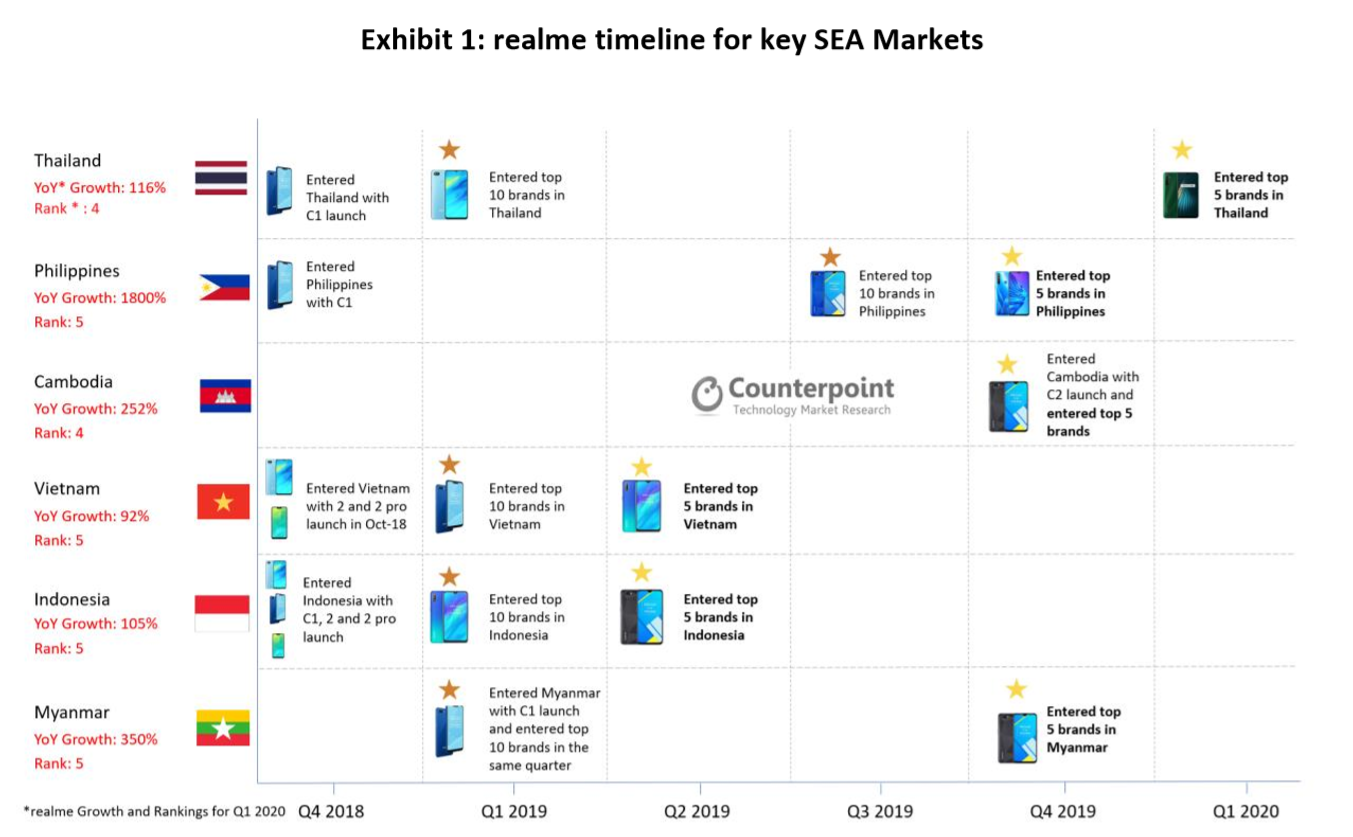 ผลการวิจัยล่าสุดจาก Counterpoint Research Market Monitor ในไตรมาสที่ 1 ปี 2563 เผยว่า realme ครองอันดับ 5 ในตลาดสมาร์ทโฟนเอเชียตะวันออกเฉียงใต้ด้วยการเติบโต 173% เมื่อเทียบกับปีก่อน ถือเป็นแบรนด์สมาร์ทโฟนที่เติบโตเร็วที่สุดในภูมิภาค