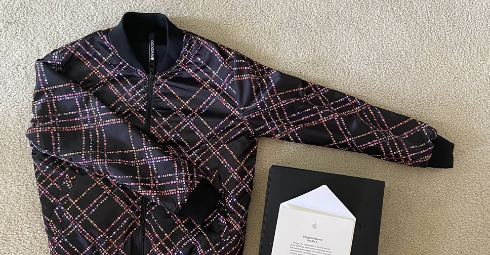 ผู้ชนะการแข่ง Swift Student Challenge ได้แชร์ของรางวัลที่พวกเขาได้รับ เป็นเสื้อแจ็คเก็ตลายลายสก๊อตโดยลายเส้นที่เห็นเกิดจากการนำอิโมจิมาเรียงต่อกัน และยังได้รับเข็มกลัดที่เป็นเอกลักษณ์ของ Apple