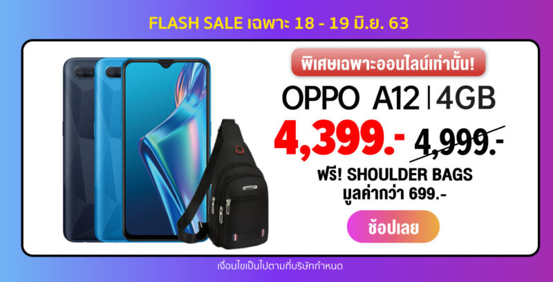Flash Sale ซื้อสมาร์ทโฟนในราคาสุดคุ้ม เมื่อซื้อ OPPO A12 4GB น้องใหม่สเปคแรง RAM 4GB ROM 64GB พิเศษเพียง 4,399 บาท จากปกติ 4,999 บาท พร้อมรับฟรี! Shoulder Bags มูลค่า 699 บาท