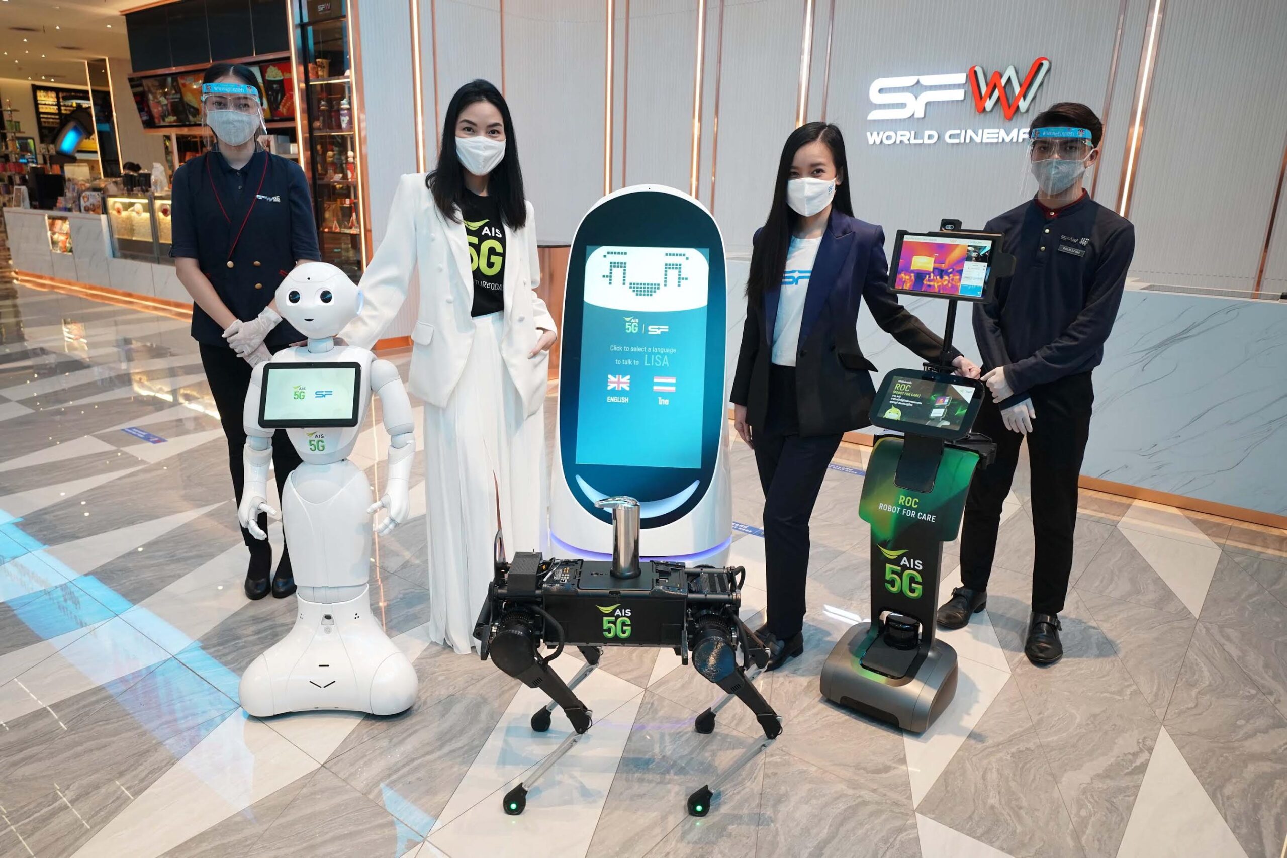 ได้แก่ หุ่นยนต์ ROBOT FOR CARE (ROC), AIS K9, LISA และ PP ทำหน้าที่คอยต้อนรับ ให้ข้อมูลลูกค้า และนำทางจากจุดหนึ่งไปยังอีกจุดที่กำหนดไว้, ช่วยคัดกรอง ตรวจวัดอุณหภูมิลูกค้า ให้บริการเจลแอลกอฮอลล์ ก่อนเข้าโรงภาพยนตร์ เพื่อลดการสัมผัส และป้องกันการแพร่ระบาดของ COVID-19 ภายในพื้นที่โรงภาพยนตร์ เอส เอฟ เวิลด์ ซีเนม่า ศูนย์การค้าเซ็นทรัลเวิลด์