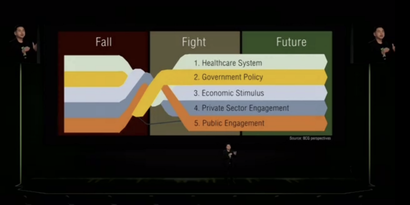 โดยจะเห็นปรากฏการณ์เป็น 3 ช่วง คือ ช่วงตกต่ำจากวิกฤต หรือ FALL ต่อมาคือ ช่วงแห่งการต่อสู้เพื่อให้ก้าวผ่านวิกฤตไปให้ได้ หรือ FIGHT และช่วงสร้างอนาคตอย่างยั่งยืน หรือ FUTURE ซึ่งในทุกช่วงเวลาล้วนแล้วแต่ต้องมีโครงสร้างพื้นฐานด้านดิจิทัลเข้ามาเป็นฐานรากที่แข็งแกร่งเพื่อช่วยประคับประคองและเสริมขีดความสามารถทั้งสิ้น โดยเฉพาะอย่างยิ่งเทคโนโลยีใหม่ล่าสุด อย่าง AIS 5G