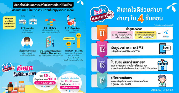 บริษัท โทเทิ่ล แอ็คเซ็ส คอมมูนิเคชั่น จำกัด (มหาชน) หรือดีแทค จัดแคมเปญ ‘ใจดีช่วยค่ายา’ ช่วยลดภาระค่าใช้จ่ายเรื่องซื้อยารักษาโรค ในยามที่เกิดเจ็บป่วย ให้เข้าถึงร้านยาคุณภาพที่มีใบอนุญาต และมีเภสัชกรประจำตลอดเวลาเปิดร้าน ได้ทั่วถึงทุกที่ในประเทศไทย โดยแคมเปญนี้ สำหรับลูกค้าดีแทคทั้งระบบเติมเงิน และรายเดือน สามารถซื้อคูปองช่วยจ่ายค่ายาในราคา 89 บาทและ 150 บาท สามารถนำไปซื้อยาที่ร้านขายยาที่ร่วมโครงการ ได้ในมูลค่าสูงสุด 300 บาท เพียงแค่โชว์ข้อความ SMS จากโทรศัพท์มือถือที่ร้านขายยา ก็รับยากลับบ้านได้เลย เริ่มตั้งแต่วันนี้ – 31 ธันวาคม 2563 ดูข้อมูลเพิ่มเติมได้ที่ www.dtac.co.th/s/Evoucher