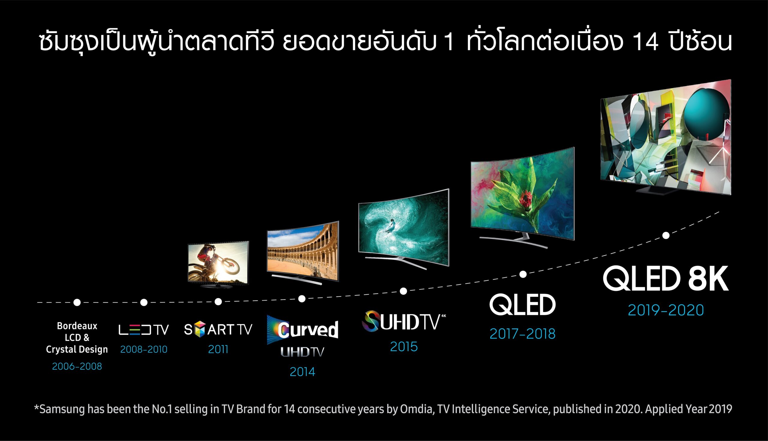 ซัมซุงไม่เคยหยุดพัฒนานวัตกรรมด้านภาพและเสียง โดยสร้างสรรค์เทคโนโลยีใหม่ๆ แห่งยุคสู่ทีวีให้ผู้บริโภคได้ตื่นเต้นอยู่เสมอ ไม่ว่าจะเป็น The Bordeaux LCD TV ทีวีแอลซีดี ดีไซน์พรีเมี่ยมจากแรงบันดาลใจของความโค้งมนจากแก้วไวน์ ที่ขายมากกว่าล้านเครื่อง ในปี 2006, Full HD 3D LED TV ทีวี 3D แอลอีดีรุ่นแรกของโลก ที่สามารถมอบประสบการณ์ความบันเทิงสมจริง ด้วยการรับชมแบบสามมิติ ในปี 2010, Curved UHD TV ทีวีจอโค้งรุ่นแรกของโลก ที่มาพร้อมความโค้ง (Screen Curvature) 4200R ให้คุณได้ดื่มด่ำกับการรับชมภาพแบบสมจริง ในปี 2014, SUHD TV ทีวี Quantum Dot ปราศจากสารแคดเมียมรุ่นแรก และหน้าจอเทคโนโลยี Quantum Dot ช่วยให้ภาพมีความแม่นยำของสีมากกว่าทีวีทั่วไปถึง 64 เท่า ในปี 2016, QLED TV ทีวีที่สร้างนิยามใหม่แห่งความคมชัด เผยรายละเอียดที่ซ่อนอยู่ด้วย High Dynamic Range ทีวีนวัตกรรมล้ำสมัยแห่งยุค Ultra High Definition ในปี 2018 และล่าสุดกับ QLED 8K ในปี 2020 นี้
