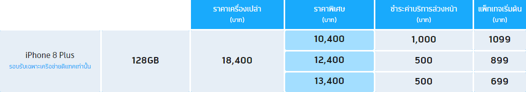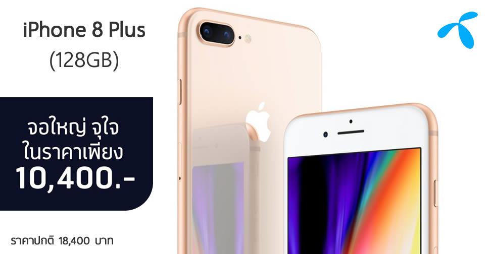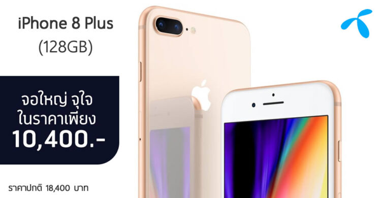 iPhone 8 Plus รุ่น 128GB ราคาเพียง 10,400 บาท จาก Dtac สำหรับลูกค้าเปิดเบอร์ใหม่, ย้ายค่ายเบอร์เดิม, เปลี่ยนจากเติมเงินเป็นรายเดือน, ลูกค้าปัจจุบันในระบบรายเดือน โดยซื้อพร้อมชำระค่าบริการล่วงหน้า 1,000 บาท สมัครแพ็กเกจรายเดือนเริ่มต้น 1,099 บาท และทำสัญญาใช้บริการนาน 12 เดือน