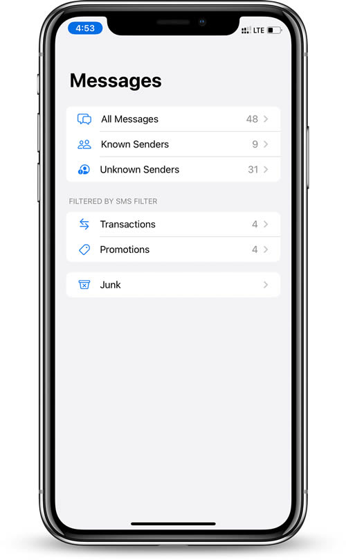 ตัวกรองในแอพข้อความ ช่วยให้ผู้ใช้งาน iPhone สามารถคัดกรองข้อความเข้าโดยอัตโนมัติตามผู้ส่งที่รู้จัก, ผู้ส่งที่ไม่รู้จัก, โปรโมชั่น, การทำธุรกรรม และ ข้อความขยะ แต่ฟีเจอร์นี้ยังใช้งานได้เฉพาะในอินเดียเท่านั้น