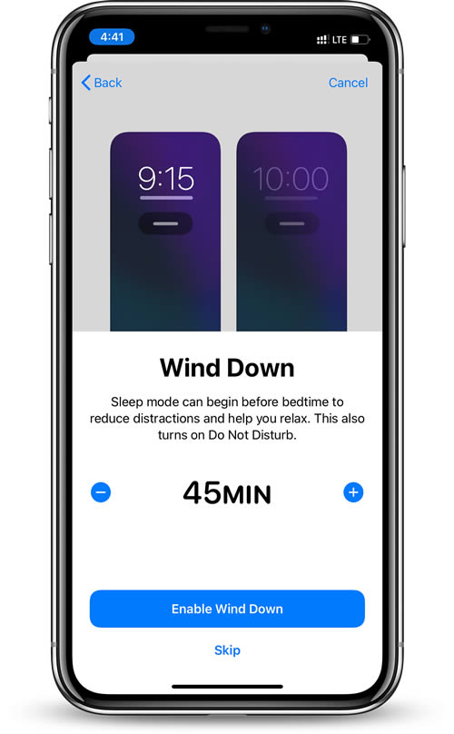 Wind Down ทำงานสอดคล้องกับ Sleep Mode ช่วยลดการรบกวนและทำให้ผู้ใช้งานรู้สึกผ่อนคลายก่อนเข้านอน โดยสามารถตั้งเวลาเปิดใช้งาน Wind Down ก่อนเริ่ม Sleep Mode ได้