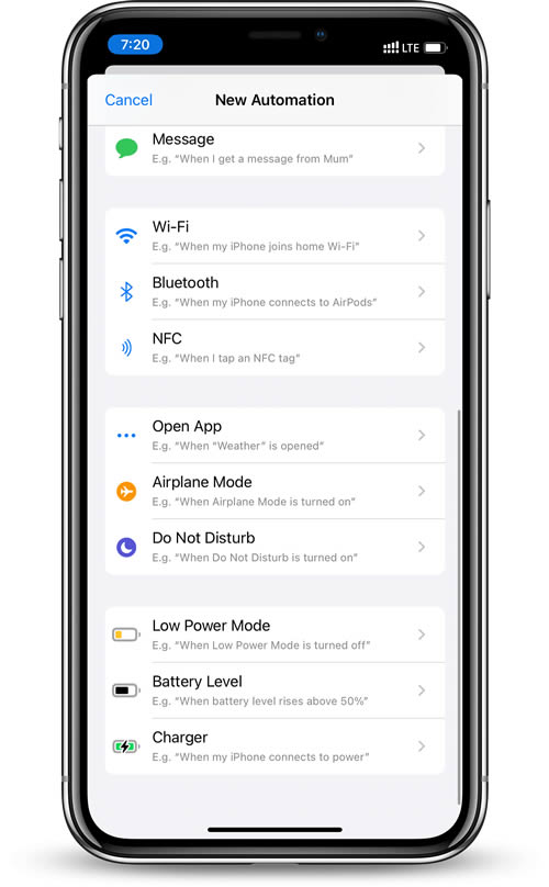Siri Shortcut ใน iOS 14 ได้รับฟีเจอร์ใหม่ที่ช่วยให้ฟีเจอร์บางอย่างทำงานโดยอัตโนมัติ เมื่อ iPhone กำลังชาร์จแบตเตอรี่ หรือ อยู่ในโหมดพลังงานต่ำ ตัวอย่างเช่น สั่งให้ Siri ช่วยปิดโหมดโหมดห้ามรบกวน, การเชื่อมต่อ Bluetooth, ลดความสว่าง, ปิดการระบุตำแหน่ง และ ตั้งค่าการใช้งานอื่นๆ เมื่อ iPhone เข้าสู่โหมดพลังงานต่ำ