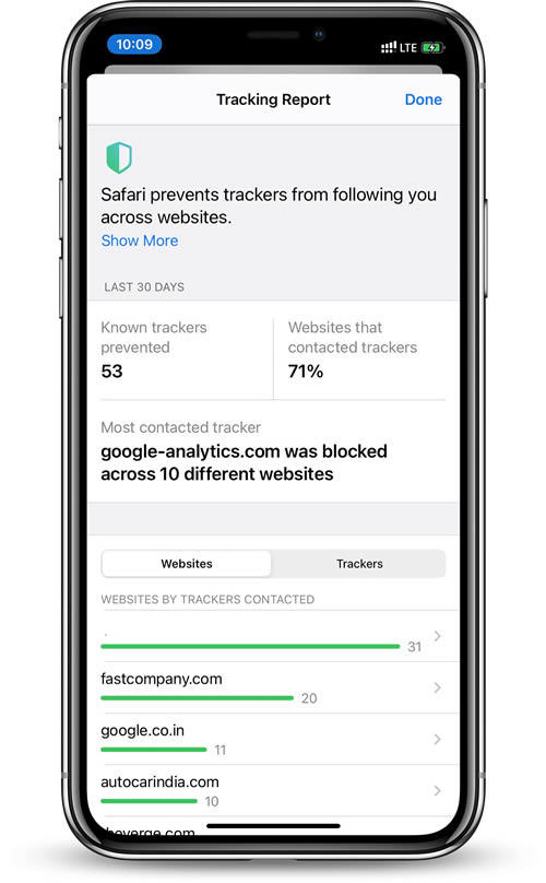 แอพ Safari ใน iOS 14 จะรายงานด้านความเป็นส่วนตัวของแต่ละเว็บไซต์ เพื่อให้ผู้ใช้งานตรวจสอบว่าเว็บไซต์ที่กำลังเยี่ยมชมอยู่นั้นจัดการกับความเป็นส่วนตัวอย่างไรบ้าง โดยแตะที่เมนูด้านบนในแถบป้อนที่อยู่เว็บไซต์