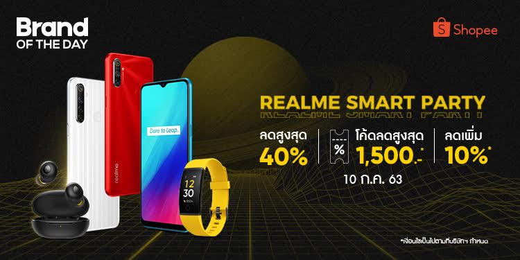realme แบรนด์สมาร์ทโฟนเพื่อคนรุ่นใหม่ที่เติบโตเร็วที่สุดในโลก ร่วมมือ Shopee จัดแคมเปญสุดสมาร์ทกับ realme Smart Party พร้อมส่งสมาร์ทโฟนและผลิตภัณฑ์ AIoT มามอบราคาสุดพิเศษลดสูงสุดถึง 40% พร้อม Surprise Voucher ทั้งวันส่วนลดสูงสุดถึง 1,500 บาท นอกจากนี้สำหรับ 115 คำสั่งซื้อแรกสำหรับซื้อสมาร์ทโฟนรับของรางวัลสุดพิเศษมูลค่ารวมมากกว่า 1 แสนบาท เฉพาะวันที่ 10 กรกฎาคมนี้ เวลา 00:00 น. ถึง 23:59 น. ทาง realme Official Shop ใน Shopee Mall เท่านั้น