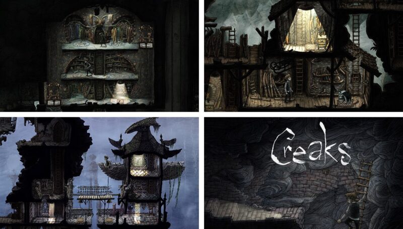 ในเกม Creaks ผู้เล่นจะได้สำรวจแมนชั่นลึกลับด้วยการปีนอย่างช้าๆ ไปสู่โลกเหนือจริงที่เต็มไปด้วยสิ่งมีชีวิตมีปีกและสัตว์ประหลาดมหาภัย ผู้เล่นจะไม่สามารถจับสัตว์ประหลาดที่เปลี่ยนรูปร่างเหล่านี้ได้ในความมืด แต่เมื่อพวกมันโดนแสงอาทิตย์ก็จะกลายร่างเป็นเครื่องเรือนไร้พิษสงทันที โดยผู้เล่นต้องแก้ไขปริศนาจากเครื่องเรือนเหล่านี้เพื่อไปต่อ ตัวเกมเต็มไปด้วยมนต์เสน่ห์ไม่ว่าจะเป็นภาพในเกมที่วาดด้วยมือ เกมเพลย์ที่สนุกจนหยุดเล่นไม่ได้ และเพลงประกอบจาก Joe Acheson สมาชิกวง Hidden Orchestra และนักประพันธ์ชาวสกอต