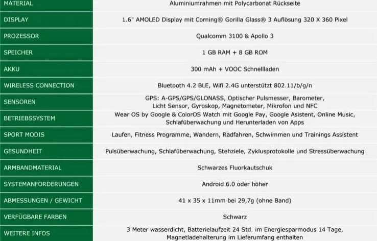อย่างไรก็ตาม OPPO Watch ในประเทศเยอรมันดูเหมือนจะมีสเปกที่แตกต่างออกไปจากเวอร์ชั่นที่เปิดตัวในประเทศจีน ตามตารางด้านล่าง