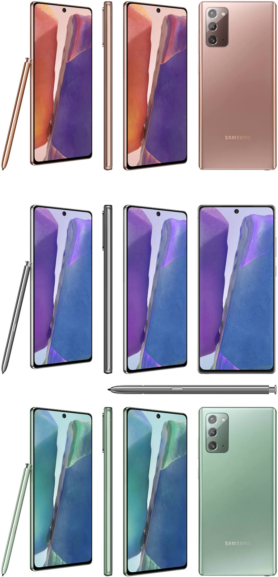 หลังจาก Samsung Galaxy Note 20 Ultra ถูกปล่อยเรนเดอร์ทางการออกมาก่อนหน้านี้ ล่าสุดก็ถึงคิวรุ่นน้อง Galaxy Note 20 ซึ่่งมาในสี Mystic Bronze และ Mystic Black เช่นเดียวกัน แต่ว่ามีสี Mystic Green ให้เลือกด้วย และยังแบ่งออกเป็นเวอร์ชั่น 5G และ 4G โดยเวอร์ชั่น 4G ผ่านการรับรองจากสำนักงาน กสทช. ของไทยเรียบร้อยแล้ว