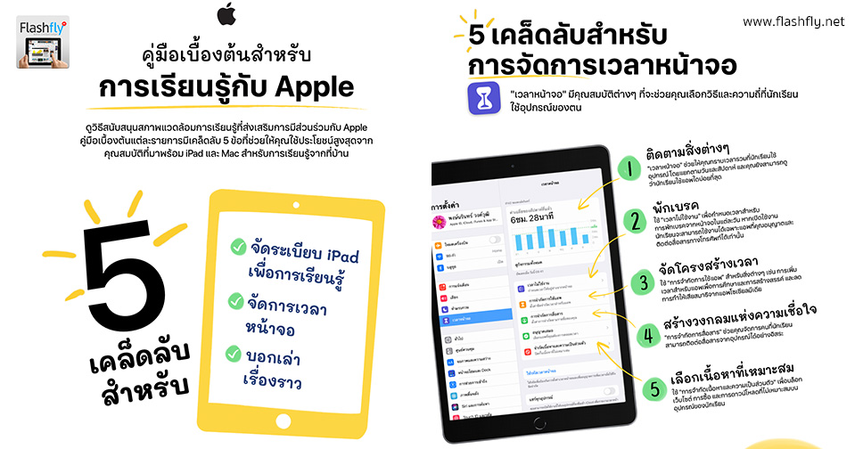 สำหรับใครที่ยังเรียนรู้จากที่บ้าน Apple ก็มีคู่มือแนะนำการจัดสภาพแวดล้อมที่ส่งเสริมการเรียนรู้ โดยคู่มือเบื้องต้นแต่ละรายการมีเคล็ดลับ 5 ข้อที่ช่วยให้คุณใช้ประโยชน์สูงสุดจากคุณสมบัติที่มาพร้อม iPad และ Mac อาทิ