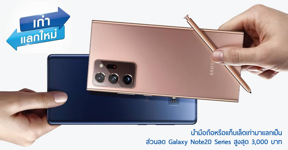 Samsung จัดโปรโมชั่น Trade-in เก่าแลกใหม่! สามารถนำสมาร์ทโฟนหรือแท็บเล็ตเครื่องเก่า มาแลกซื้อสมาร์ทโฟนเรือธงรุ่นใหม่ล่าสุด Galaxy Note 20 และ Galaxy Note 20 Ultra โดยจะได้รับส่วนลดสูงสุด 3,000 บาท