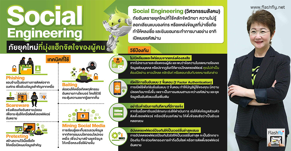 นางสายชล ทรัพย์มากอุดม หัวหน้าฝ่ายงานประชาสัมพันธ์ เอไอเอส กล่าวว่า “ในฐานะผู้พัฒนา Digital infrastructure ของประเทศ เรามีความห่วงใยคนไทยต่อการเสี่ยงถูกโจรกรรมข้อมูล ซึ่งในปัจจุบันแฮ็กเกอร์ได้พัฒนาเล่ห์เหลี่ยมใหม่ๆ ทำให้เหยื่อหลงเชื่อและให้ข้อมูลแก่ตน โดยอาศัยหลักจิตวิทยา ความไม่รู้ หรือความประมาทของเหยื่อ ลอกเลียนแบบองค์กรหรือแหล่งข้อมูลที่น่าเชื่อถือเพื่อให้หลงเชื่อและกระทำการบางอย่าง อาทิ เปิดเผยรหัสผ่าน ซึ่งในทางสากลเรียกกลวิธีแบบนี้ว่า Social Engineering หรือ วิศวกรรมสังคม ดังเช่น กรณีสื่อโซเชียลมีเดียชื่อดัง ถูกแฮ็กเกอร์เข้าถึงระบบหลังบ้าน ผ่านการปลอมแปลงเป็นเว็บไซต์ภายใน ก่อให้เกิดความเสียหายรวมกว่า 1 แสนดอลลาร์สหรัฐ