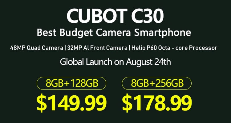 Cubot C30 มีแผนวางจำหน่ายไปทั่วโลก ในวันที่ 24 สิงหาคมนี้ ราคา 150 ดอลล่าร์สหรัฐ หรือราว 4,690 บาท สำหรับรุ่น RAM 8GB + ROM 128GB และราคา 180 ดอลล่าร์สหรัฐ หรือราว 5,690 บาท สำหรับรุ่น RAM 8GB + ROM 256GB มีให้เลือก 2 สี ได้แก่ สีเขียว และ สีดำ