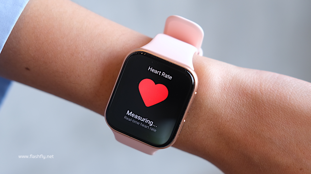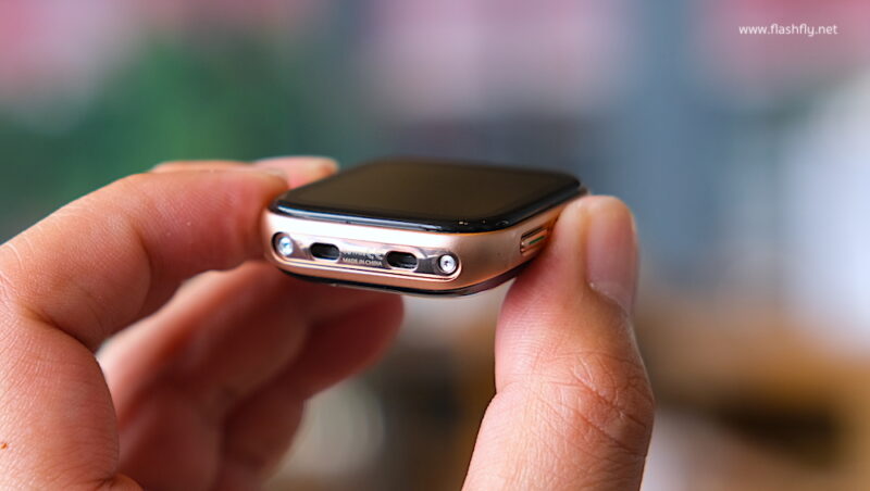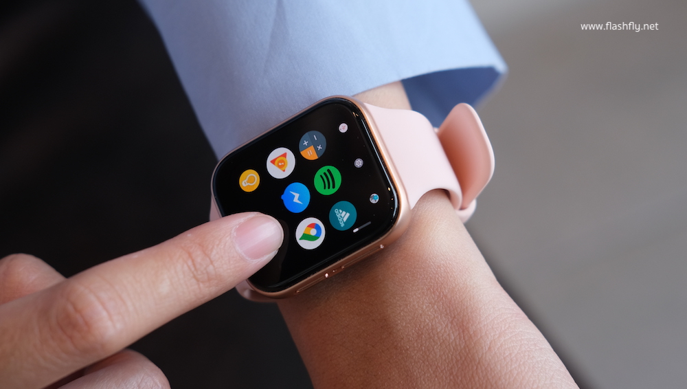ถือว่ามีหน้าจอใหญ่ดูง่ายสบายตากว่าสมาร์ทวอทช์ทั่วไป และยังให้ความคมชัดสูงด้วยการสนับสนุนขอบเขตสีกว้าง DCI-P3 100% ความหนาแน่นพิกเซล 326 PPI และมีอัตราส่วนหน้าจอต่อบอดี้ 72.76%