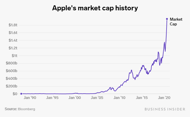 Apple เริ่มเข้าสู่ตลาดหลักทรัพย์ในปี 1980 หรือเมื่อ 40 ปีที่แล้ว และในวันที่ 2 สิงหาคม 2018 เป็นครั้งแรกที่บริษัท Apple มีมูลค่าในตลาด 1 ล้านล้านดอลลาร์สหรัฐฯ นั่นหมายความว่า Apple ใช้เวลา 38 ปี ในการสร้างมูลค่าในตลาด 1 ล้านล้านดอลลาร์สหรัฐฯ ก่อนจะเข้าถึง 2 ล้านล้านดอลลาร์สหรัฐฯ ในอีก 2 ปีต่อมา