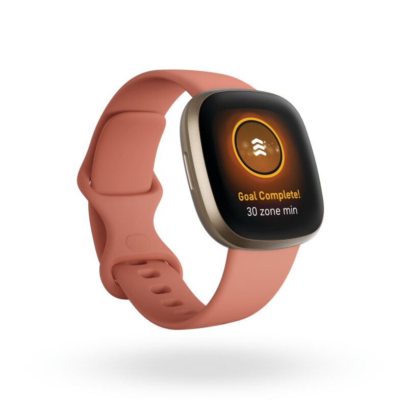 • Product render of Fitbit Versa 3, 3QTR view, in Pink Clay and Soft Gold.
