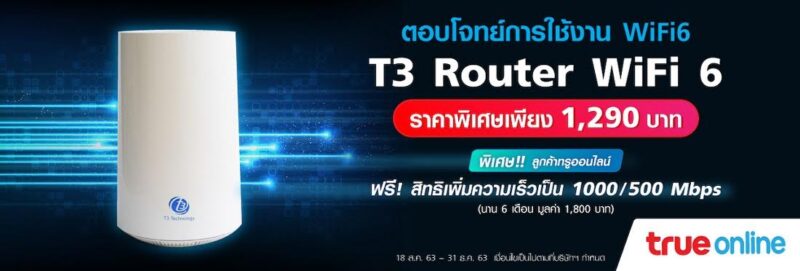 • Router WiFi 6 จาก T3:ที่พร้อมใช้งานได้เต็มประสิทธิภาพกับสมาร์ทดีไวซ์ที่รองรับ WiFi6  ราคาพิเศษเพียง 1,290 บาท ซื้อวันนี้รับสิทธิเพิ่มความเร็วเป็น 1000/500 Mbps ฟรี นาน  6 เดือน มูลค่า 1,800 บาท ที่ ทรูช็อป และTrue Store ที่ https://www.wemall.com/d/L91700346