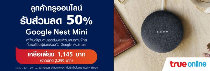 • Google Nest Mini : ลำโพงอัจฉริยะที่สั่งการได้ด้วยเสียงภาษาไทยผ่านระบบ Google Assistant  เปลี่ยนบ้านคุณให้เป็นสมาร์ทโฮม ลูกค้าทรูออนไลน์ สามารถรับส่วนลดแลกซื้อได้ในราคา 50% เหลือเพียง 1,145 บาท จากปกติ 2,290 บาท