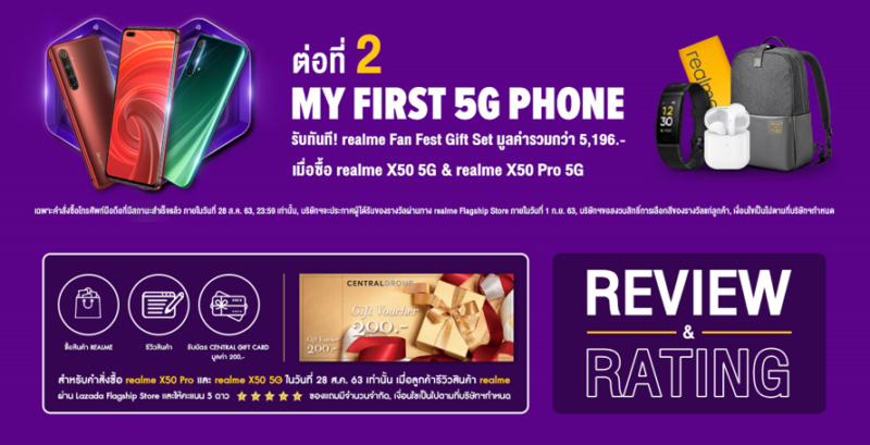 เมื่อซื้อ realme X50 5G หรือ realme X50 Pro 5G รับทันที! realme Fan Fest Gift Set ในเซตประกอบไปด้วย realme Buds Air, กระเป๋า realme backpack, realme Band และ realme Powerbank มูลค่ารวมกว่า 5,196 บาท และสำหรับลูกค้าที่เขียน review และให้ rating ครบ 5 ดาว รับทันที บัตร Central Gift Card มูลค่า 200 บาท