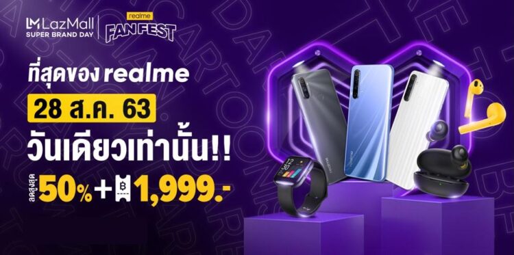 เมื่อเร็วๆนี้ realme แบรนด์สมาร์ทโฟนเพื่อคนรุ่นใหม่ที่เติบโตเร็วที่สุดในโลก จัดงาน realme Fan Festival ครั้งแรกในประเทศไทย ซึ่งเป็นกิจกรรมกระชับความสัมพันธ์ระหว่าง realme และเหล่าแฟนคลับ และฉลองการเติบโตอย่างก้าวกระโดด เพื่อต่อยอดความสำเร็จ ล่าสุด realme ร่วมมือกับ Lazada จัดแคมเปญ realme Fan Fest พร้อมนำขบวนสมาร์ทโฟนและผลิตภัณฑ์ AIoT ในเอาใจสายช้อปในราคาพิเศษ ลดสูงสุด 50 % โค้ดส่วนลดสูงสุด 1,999 บาท นอกจากนี้ เมื่อซื้อ realme X50 5G และ realme X50 Pro 5G รับฟรี realme Fan Fest Gift Set มูลค่ารวมกว่า 5,196 บาท และของรางวัลสุ่มออเดอร์ มูลค่ากว่า 620,000 บาท เฉพาะวันที่ 28 สิงหาคมนี้ ทาง realme Flagship store เท่านั้น
