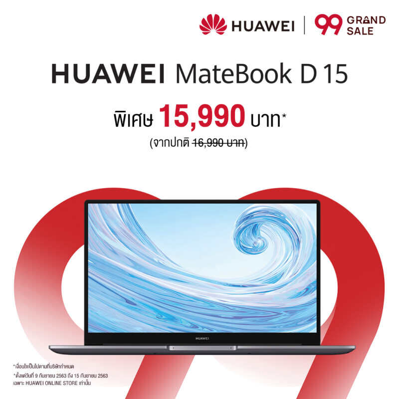 ราคาพิเศษแล็ปท็อป MateBook D15 ลด 1,000 บาท จากปกติราคา 16,990 บาท เหลือ 15,990 บาท