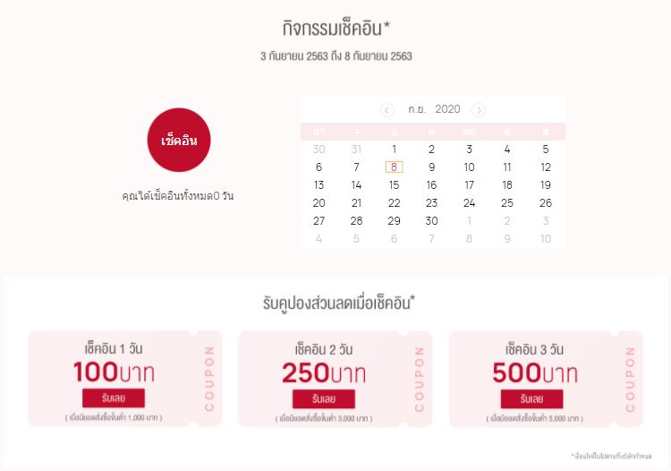 เช็คอินเช็คอินวันใดก็ได้ เพียง 1 วัน รับคูปองส่วนลดมูลค่า 100 บาท ใช้สำหรับการซื้อสินค้าตั้งแต่ 1,000 บาทขึ้นไปต่อใบเสร็จ เช็คอิน 2 วันติดต่อกัน รับคูปองส่วนลดมูลค่า 250 บาท ใช้สำหรับการซื้อสินค้าตั้งแต่ 3,000 บาทขึ้นไปต่อใบเสร็จ เช็คอิน 3 วันติดต่อกัน รับคูปองส่วนลดมูลค่า 500 บาท ใช้สำหรับการซื้อสินค้าตั้งแต่ 5,000 บาทต่อใบเสร็จ หากเลือกเคลมแบบเช็คอิน 1 วันแล้ว จะไม่สามารถใช้เคลมแบบ 2 วัน หรือ 3 วันได้ ผู้ใช้ต้องเลือกว่าต้องการเคลมมูลค่าเท่าใด เพียงครั้งเดียว