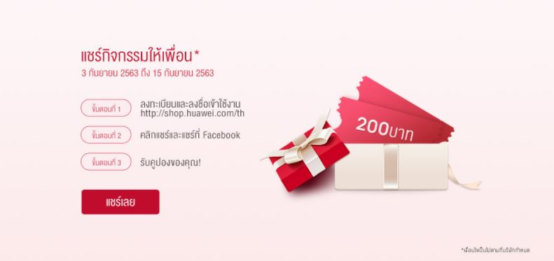แชร์กิจกรรมบนโซเชี่ยลมิเดียแชร์กิจกรรม HUAWEI 99 Grand Sale ไปยังเฟซบุ๊กส่วนตัว รับคูปองส่วนลดมูลค่า 200 บาท ใช้สำหรับการซื้อสินค้าตั้งแต่ 2,000 บาทขึ้นไปต่อใบเสร็จ
