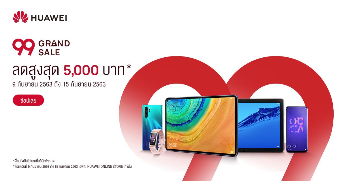 Huawei จัดโปร ‘99 Grand Sale’ 9 – 15 ก.ย.นี้ บนออนไลน์สโตร์ พบกับสินค้าราคา 99 บาท ในช่วง Flash Sale ทุกวัน พร้อมรับคูปองส่วนลดและของแถมแบบจัดเต็ม