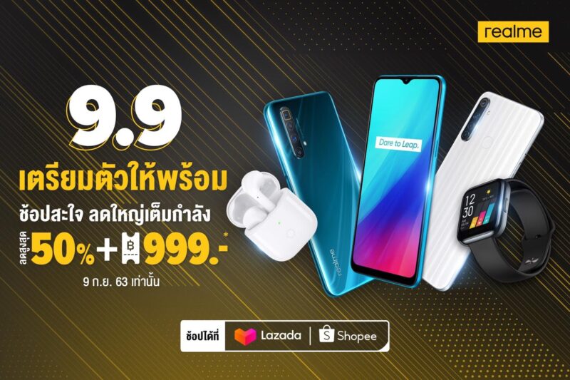 realme 9.9 มอบส่วนลดสูงสุด 50% พร้อมโค้ดลดสูงสุด 999 บาท เฉพาะวันที่ 9 กันยายนนี้ ใน realme Official Store ทาง Lazada และ Shopee เท่านั้น
