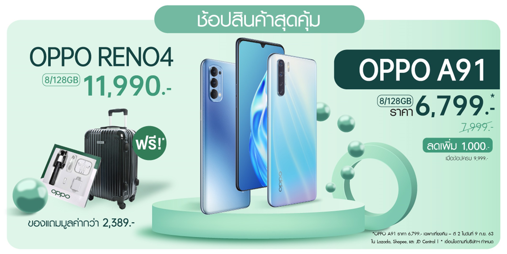 OPPO A91 สมาร์ทโฟนดีไซน์บางเฉียบพร้อม 4 กล้องหลัง “เติมเต็มทุกไลฟ์สไตล์” ลดเหลือเพียง 6,899 บาท จากราคาปกติ 7,999 บาท และโปรโมชั่นสุดคุ้ม! พิเศษเฉพาะเวลา เที่ยงคืน- ตีสอง วันที่ 9 กันยายน 2563 เท่านั้น ซื้อ OPPO A91 ใน เพียง 6,799 บาท จากปกติ 7,999 บาท สำหรับในส่วนของ OPPO Reno4 สมาร์ทโฟนที่โดดเด่นด้านการถ่ายภาพ พร้อมดีไซน์ที่ตอบโจทย์สายแฟชั่น ภายใต้สโลแกน “Clearly the best you” มาในราคา 11,990 บาท รับเพิ่มฟรี! ของสมนาคุณมูลค่ารวมกว่า 2,389 บาท