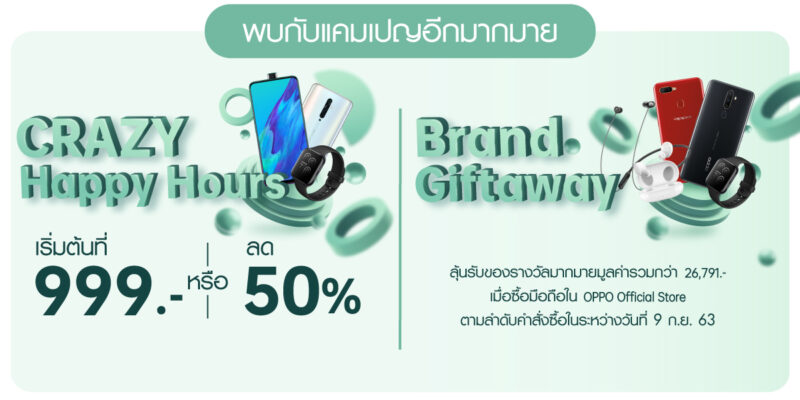 ไม่เพียงเท่านี้ OPPO ยังมอบดีลสุดคุ้มกับ  Brand Giveaway  แจกสมาร์ทโฟนและหูฟังกันไปเลยฟรีๆ เมื่อซื้อสมาร์ทโฟนในลำดับที่กำหนด ผ่าน OPPO Official Store  ใน Lazada และ Shopee  เท่านั้นโดยมีขั้นต่ำ 3,999 บาทในวันที่ 9 กันยายน 2563  โดยมีลำดับดังนี้