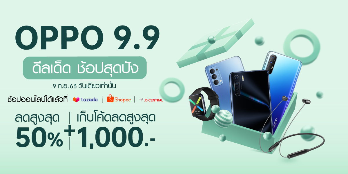 ออปโป้ จัดโปรโมชั่นสุดคุ้ม ซื้อสมาร์ทโฟนและหูฟังในราคาพิเศษ ส่วนลดสูงสุด 50% เก็บโค้ดลดสูงสุดถึง 1,000 บาท พร้อมแจกของรางวัลมูลค่ารวมกว่า 26,791 บาท กับแคมเปญ OPPO 9.9 ใน Lazada Shopee และ JD Central เฉพาะวันที่ 9 กันยายน 2563 วันเดียวเท่านั้น โดยโปรโมชั่นมีดังนี้