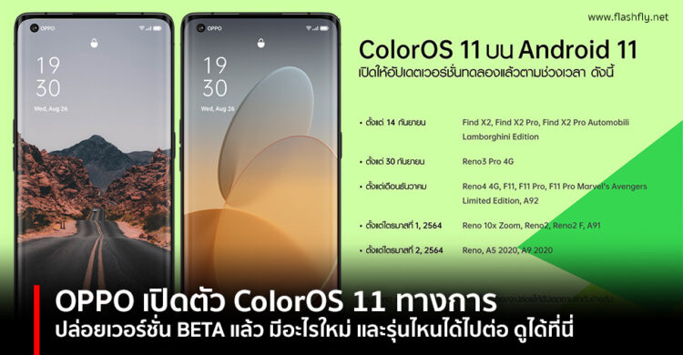 สำหรับการเปิดตัว ColorOS 11 รุ่น beta นี้ ผู้ใช้ที่ชื่นชอบเทคโนโลยีสามารถมาค้นหาฟีเจอร์ใหม่ๆ พร้อมเสนอข้อคิดเห็นต่างๆ ให้แก่พวกเราได้ ซึ่งเวอร์ชั่นที่จะใช้อย่างเป็นทางการจะเปิดตัวต่อไปในอีกไม่กี่สัปดาห์ข้างหน้านี้ โดย ColorOS 11 จะเริ่มเปิดให้ใช้งานโดยเริ่มจาก OPPO Find X2 Series และ OPPO Reno3 Pro ก่อน หลังจากนั้นจะเปิดให้ใช้งานไปยังสมาร์ทโฟนในซีรีส์ทั้ง OPPO Find, Reno, F, K และ A ดังนี้