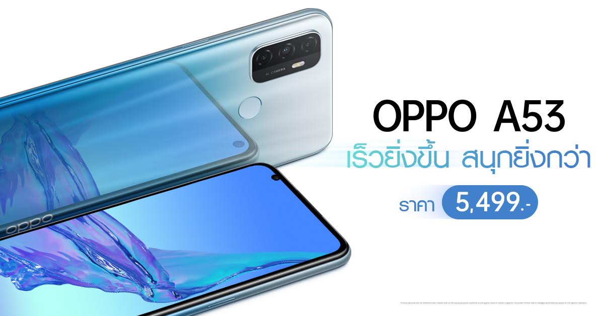 OPPO เปิดตัวสมาร์ทโฟนรุ่นล่าสุดจาก A Series หลังจากได้รับกระแสตอบรับเป็นอย่างดีจากรุ่นก่อนหน้า ที่มาพร้อมกับจุดเด่นและความคุ้มค่า โดย OPPO A53 เปิดตัวภายใต้สโลแกน “เร็วยิ่งขึ้น สนุกยิ่งกว่า” พร้อมตอบสนองทุกความต้องการของผู้บริโภคไม่ว่าจะเป็นด้านของสเปค, กล้องในราคาสุดคุ้ม สามารถตอบโจทย์กลุ่มผู้ใช้งานได้เป็นอย่างดี พร้อมให้คุณเต็มอิ่มไปกับทุกความบันเทิง