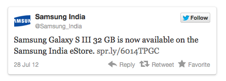 Samsung ได้วางจำหน่าย Galaxy S III รุ่นความจุ 32 GB อย่างเป็นทางการแล้วที่ Samsung India eStore ประเทศอินเดียในราคา 41,500 รูปี หรือประมาณ 24,900 บาท ซึ่งแพงกว่ารุ่น 16GB ที่ราคา 38,400 Rs หรือประมาณ 23,000 บาท อยู่เล็กน้อย ซึ่งราคาที่บ้านเรานั้นถูกกว่าที่อินเดียคือ 21,900 บาท ซึ่งถ้ารุ่น 32GB เข้ามาจำหน่ายก็น่าจะอยู่ในเรทราคาไม่แตกต่างกันมาก ใครที่มีคนรู้จักอยู่ที่อินเดียสามารถเป็นเจ้าของได้แล้ววันนี้