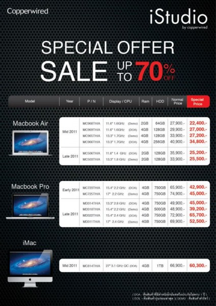 - Macbook Air Late 2011 (DEMO) : 13.3″ Ram 2 GB. HDD 128 ราคา 25,500.-